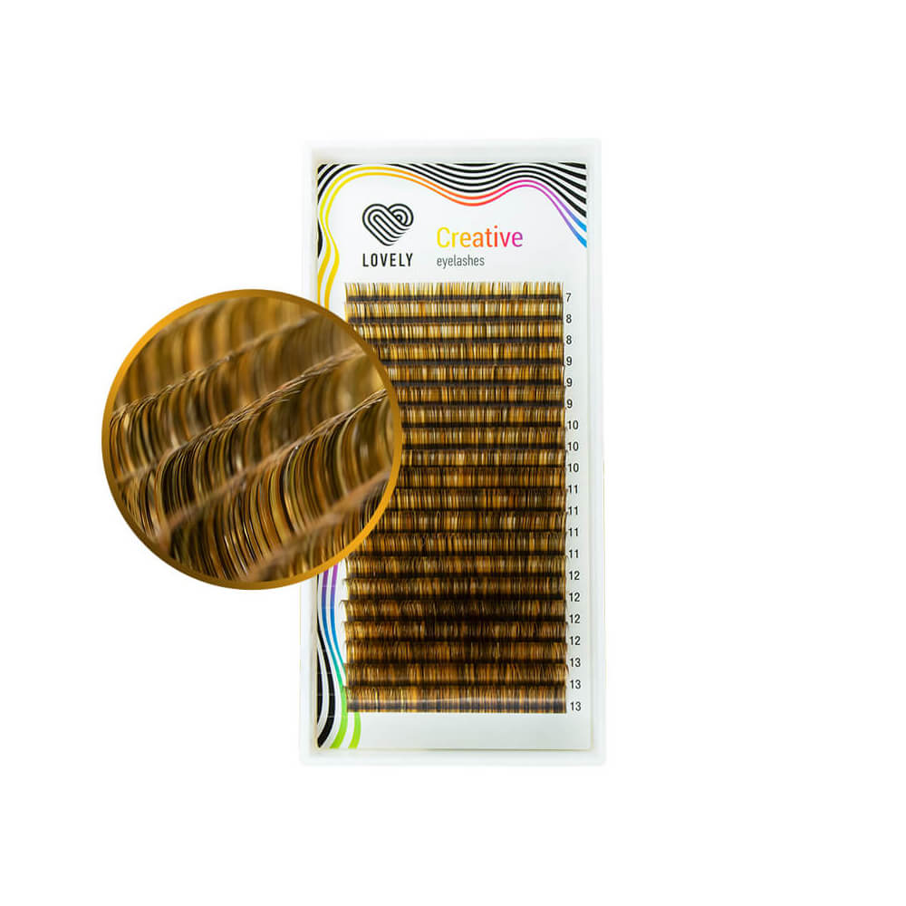 Набір вій, витриманий у теплій жовто-коричневій колірній гамі з додаванням інших відтінків. Такі вії дають змогу створити ексклюзивне нарощування, яке неможливо повторити. Усі колоровані вії Lovely виготовляються з високоякісного волокна, легкі та еластичні, не деформуються в процесі роботи і відмінно тримають форму під час носіння.